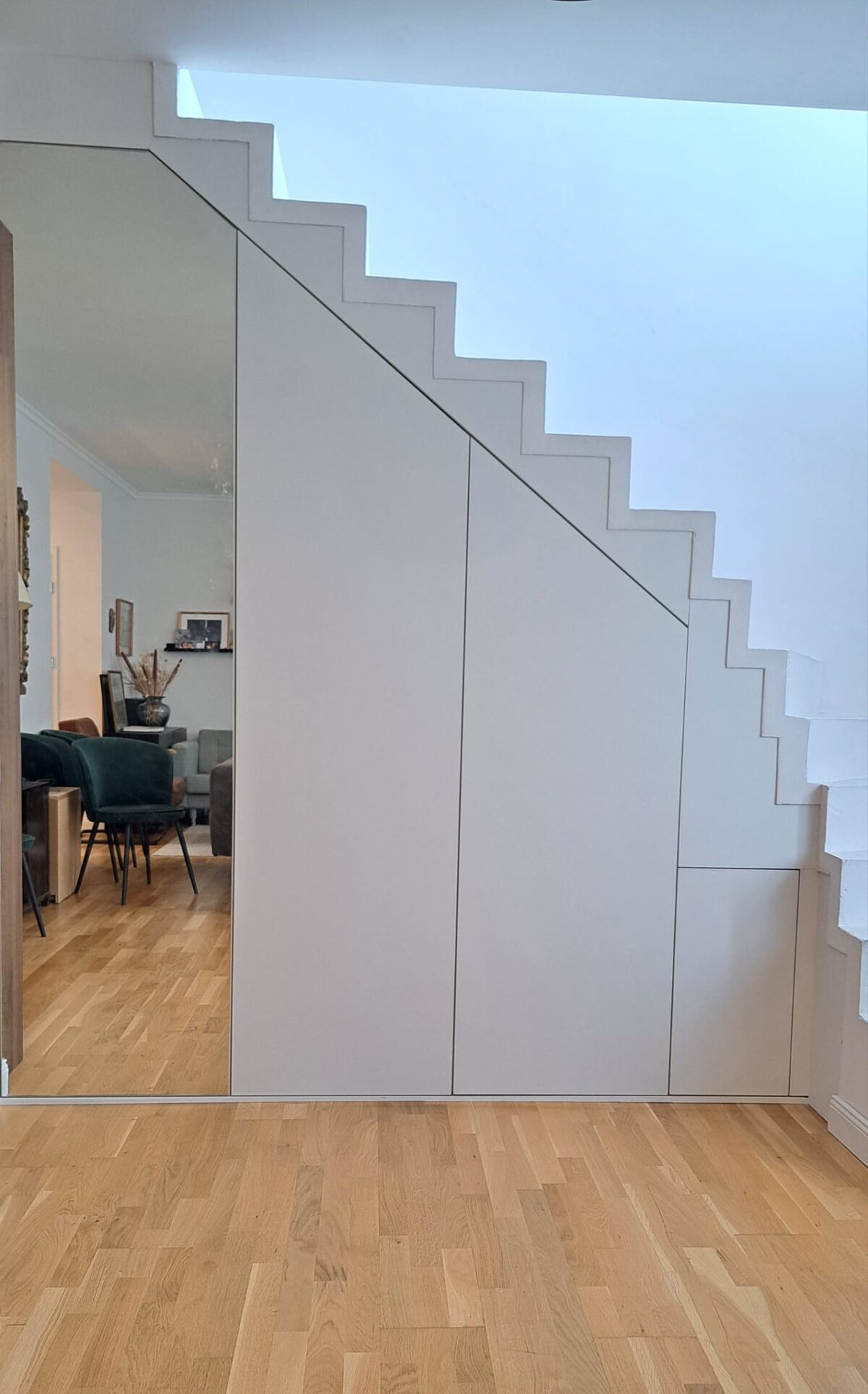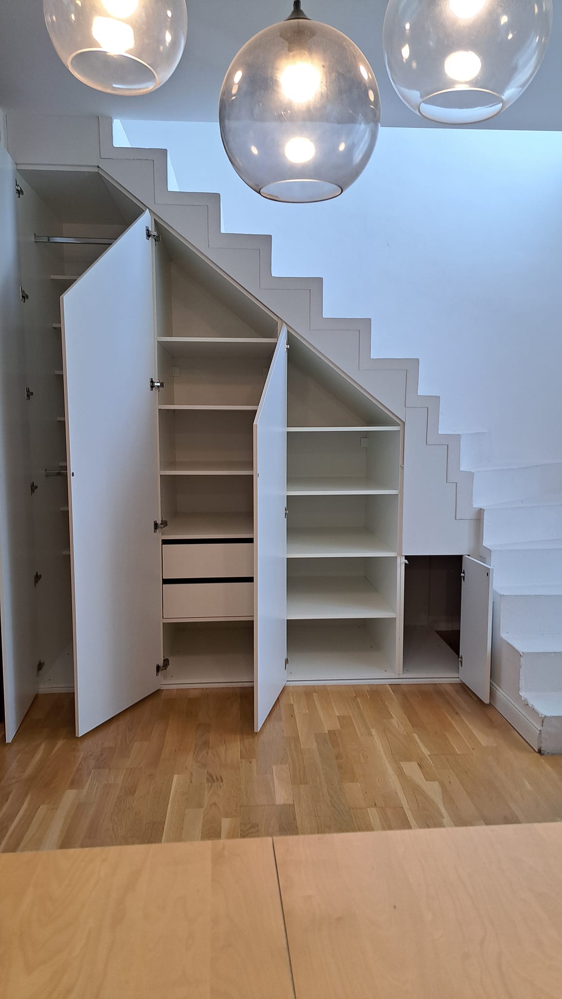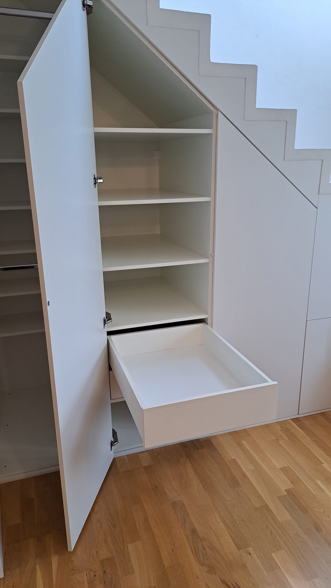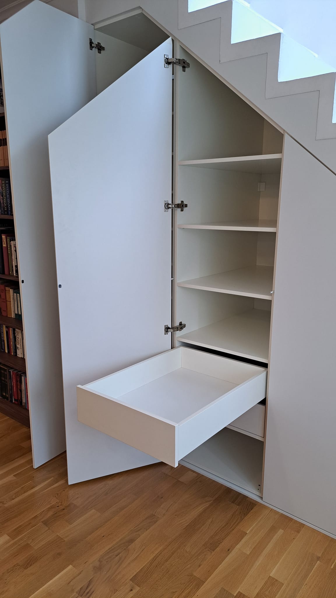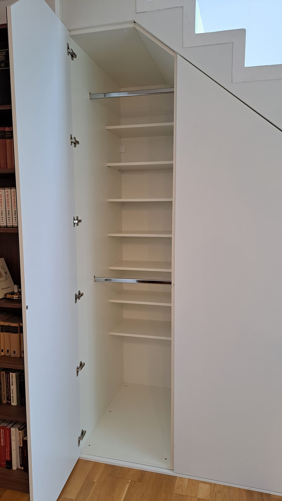 Sok munka volt vele, de a végén a képek önmagukért beszélnek! Ha szeretnéd a lépcsőd alatt a helyet hatékonyan kihasználni, keress meg, Neked is készítünk egy ilyen szépséget!