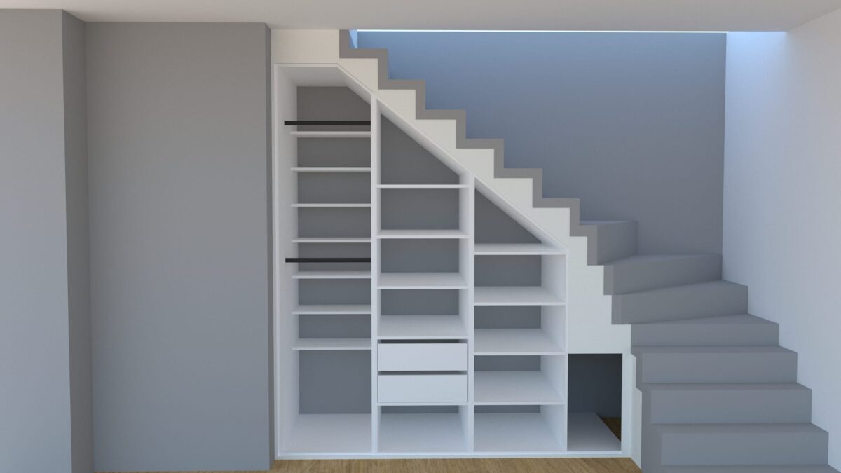 Az amúgy kihasználatlan lépcső alatti terület új értelmet nyert ezzel a bútorral, hiszen rengeteg polc és pár fiók is rendelkezésre áll a különböző dolgok eltárolására.