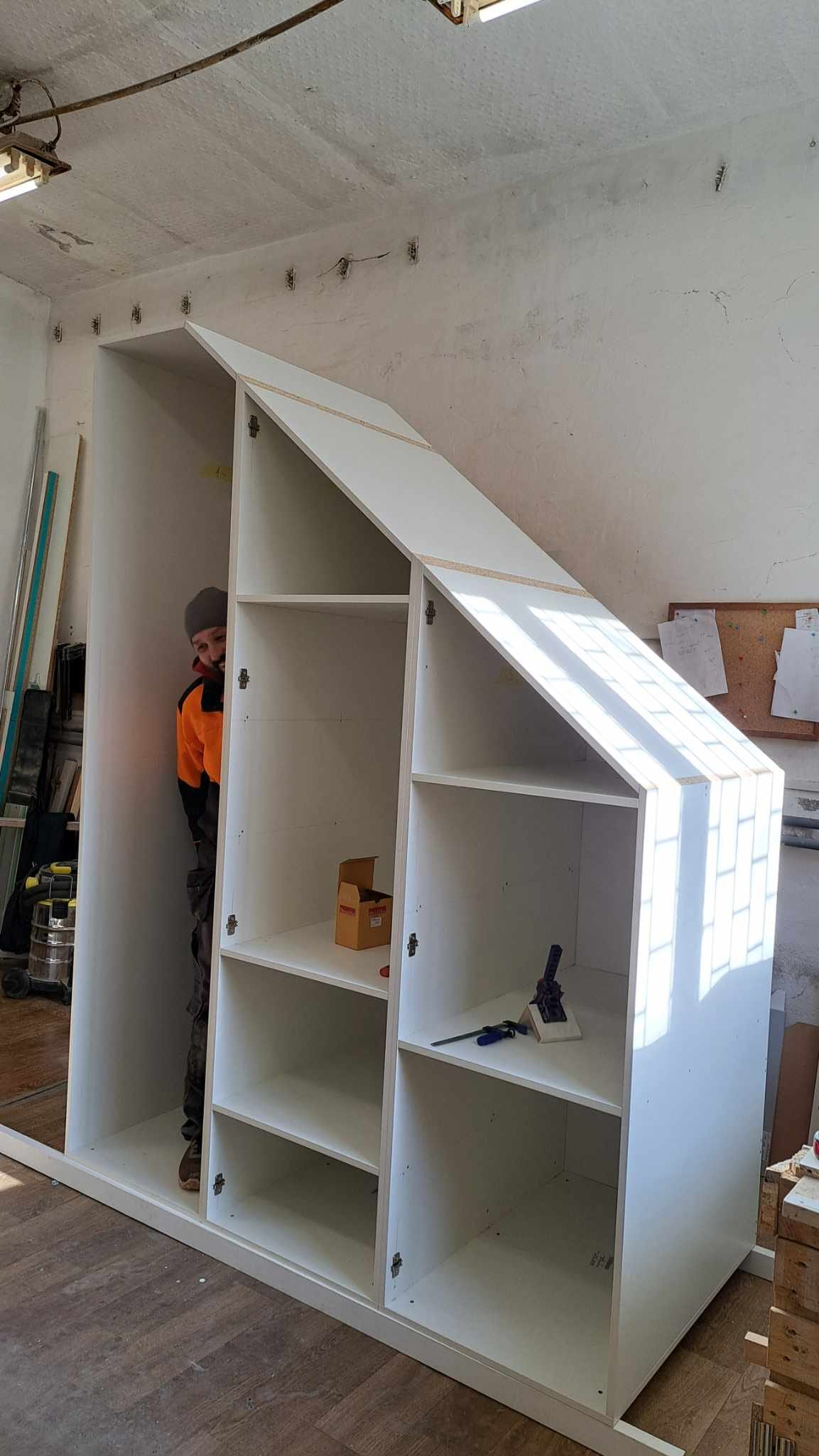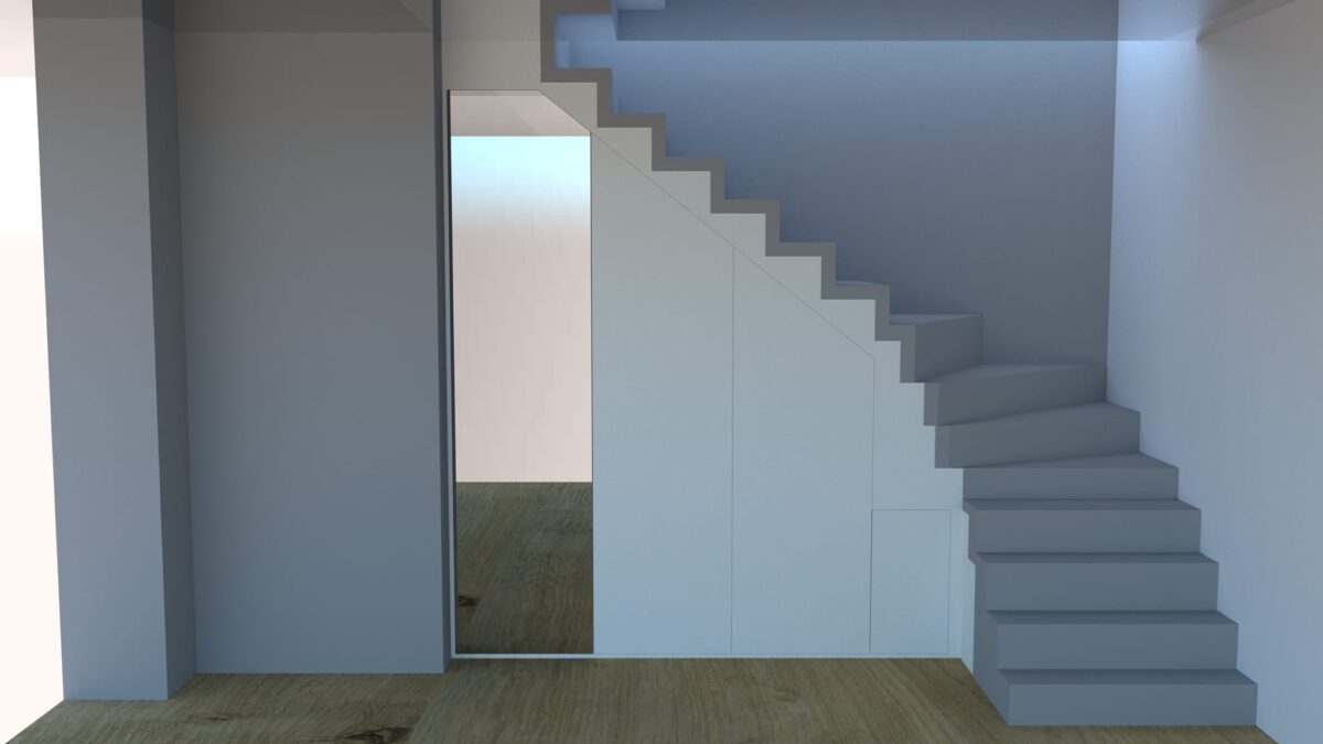 Hatalmas méretű beépített szekrényt gyártottunk egy lépcső alá. Az első 2 fotó a látványterv, a többi a megvalósult bútor. Mint ahogy azt a képen is látjátok, könnyedén elnyel egy felnőtt embert is! 🙂