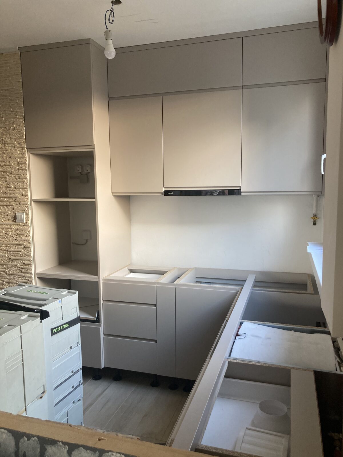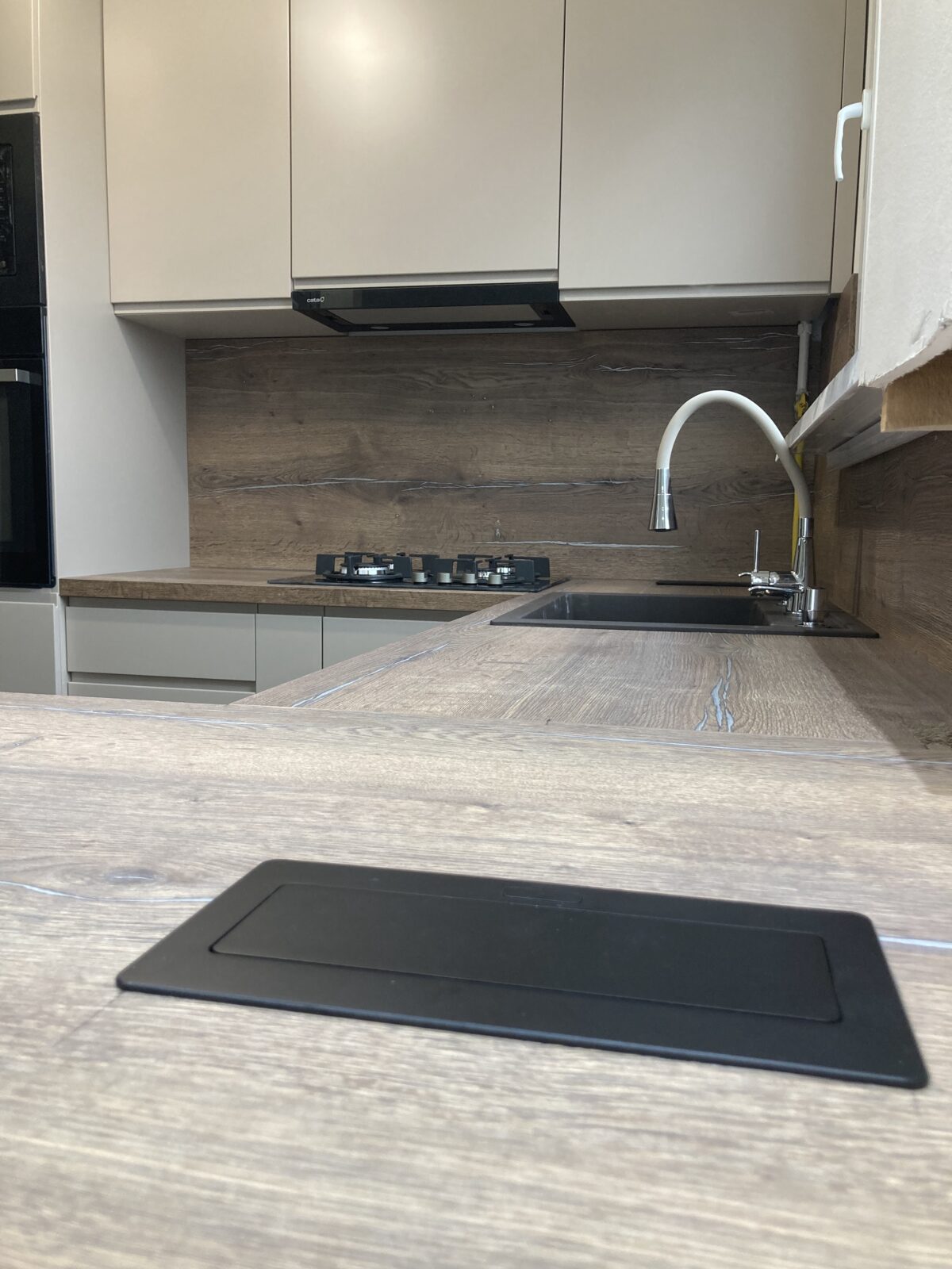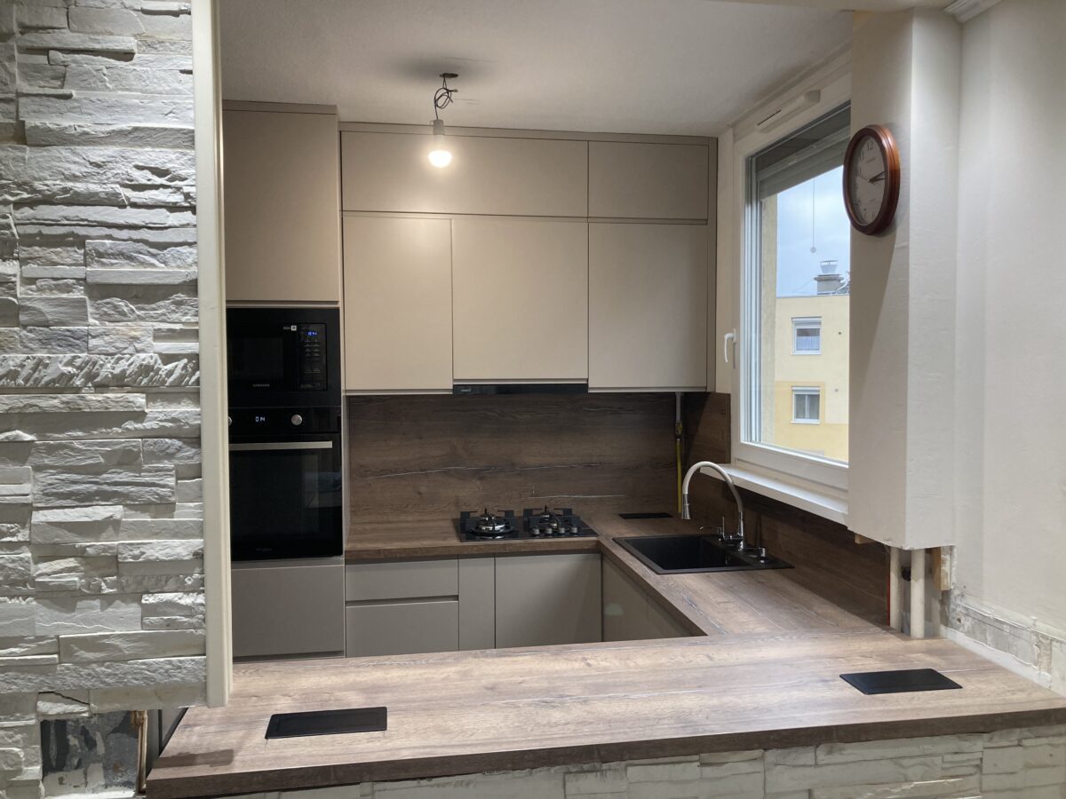 Kis helyre kellett egy modern kinézetű konyhát készítenünk. Egy fogantyú nélküli, letisztult dizájnra esett a Megrendelő választása. A mikró és a sütő beépített, ezzel is takarékoskodva a hellyel, nem mellesleg pedig hozzáadnak a letisztult dizájnhoz. A konyhapulton el lettek helyezve rejtett dugaljak is, ha valamilyen konyhai gépet akarna csatlakoztatni a háziasszony.