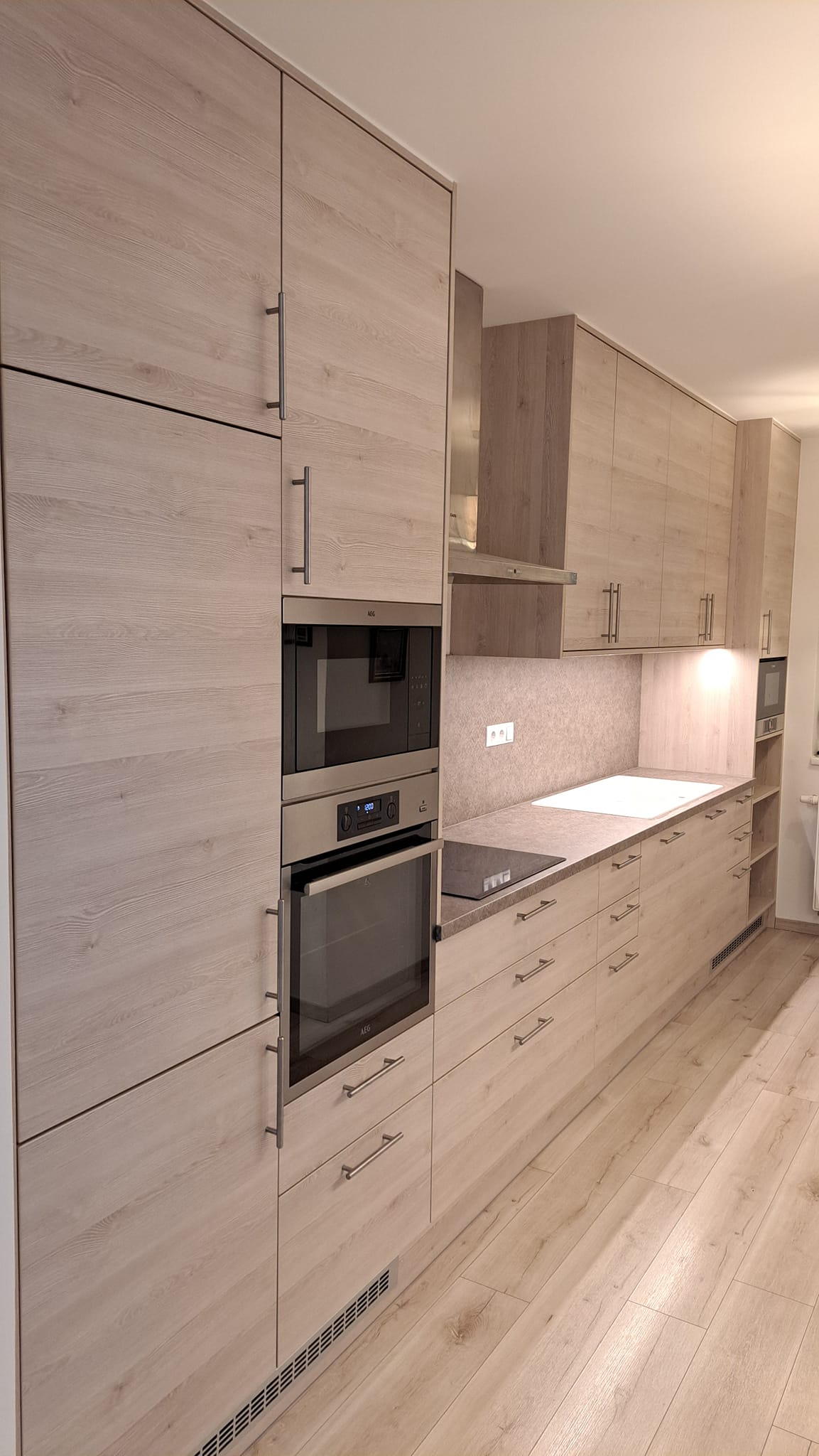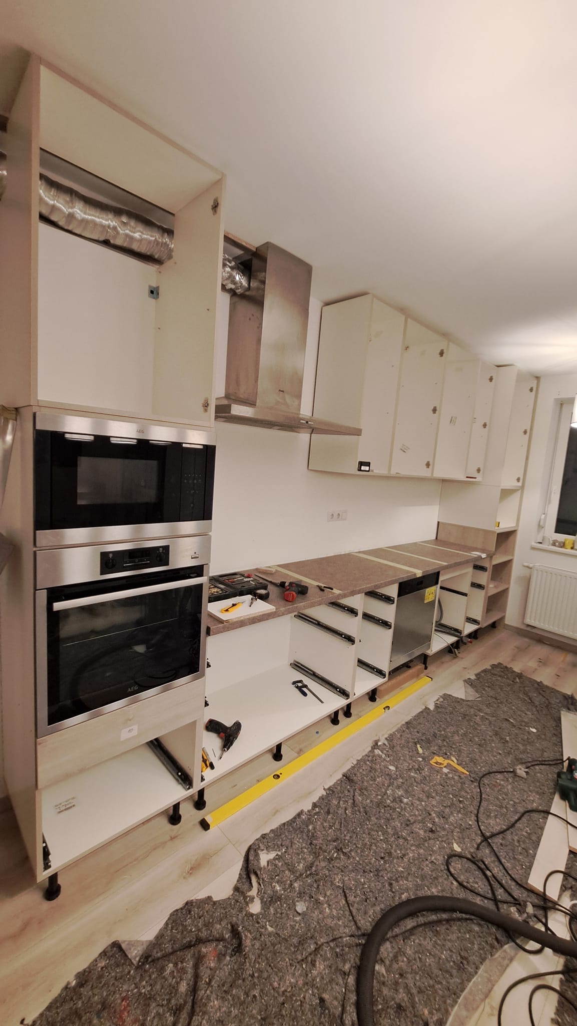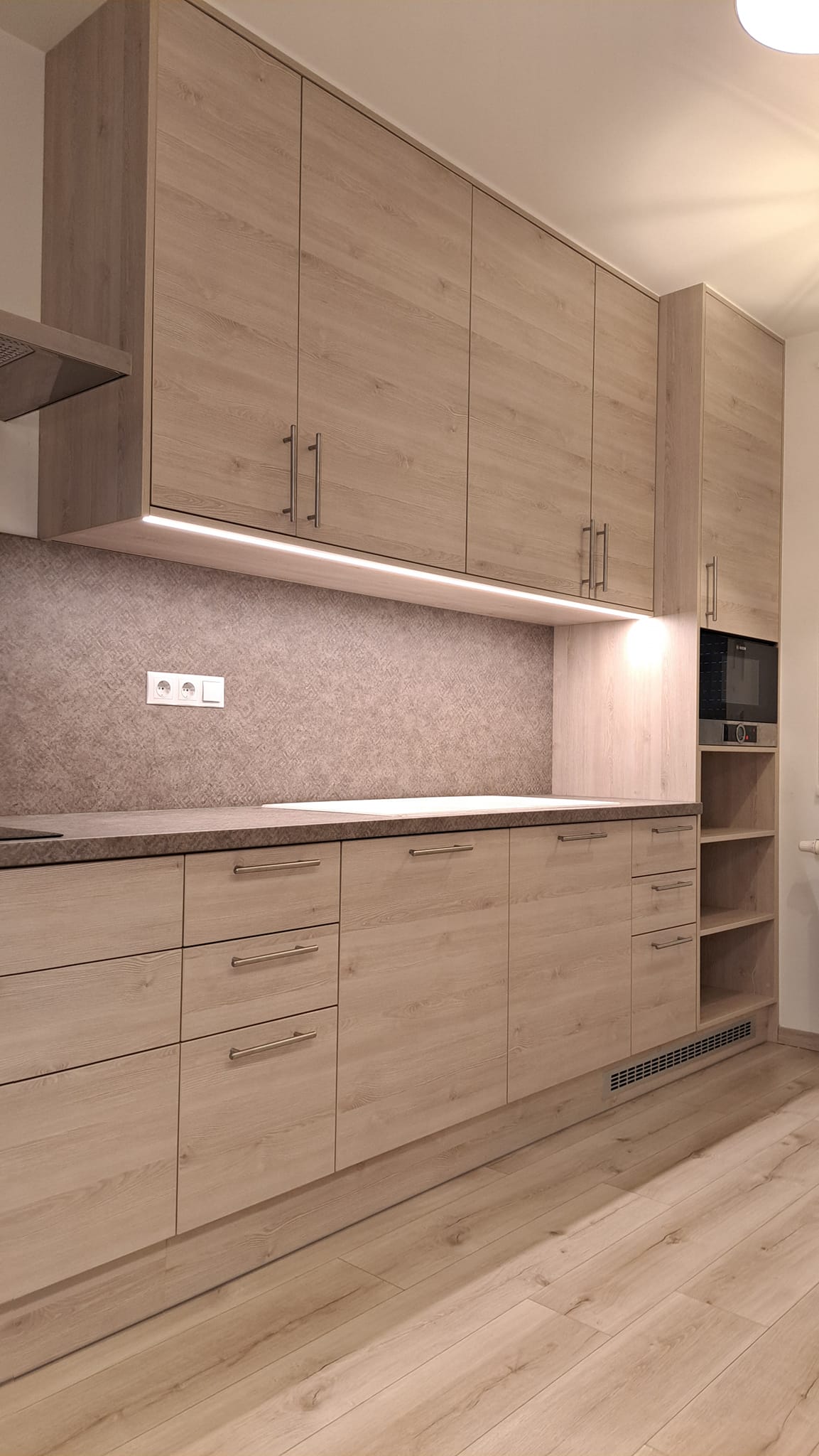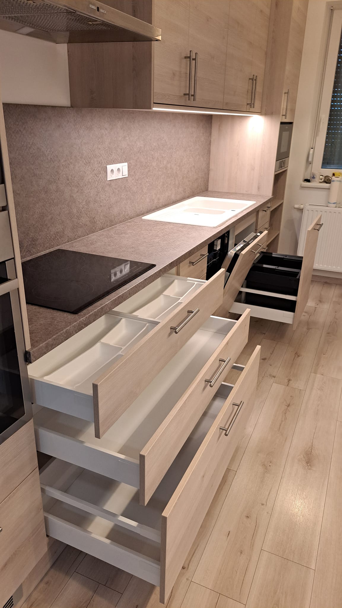 Itt láthattok építés közbeni képeket is erről a konyháról. Be lett építve a gépészet, vagyis a hűtő, a sütő és a főzőlap. Beépített és elrejtett LED világítással rendelkezik és minőségi szerelvényekkel, mint például fióksínek és szemetestartó.
