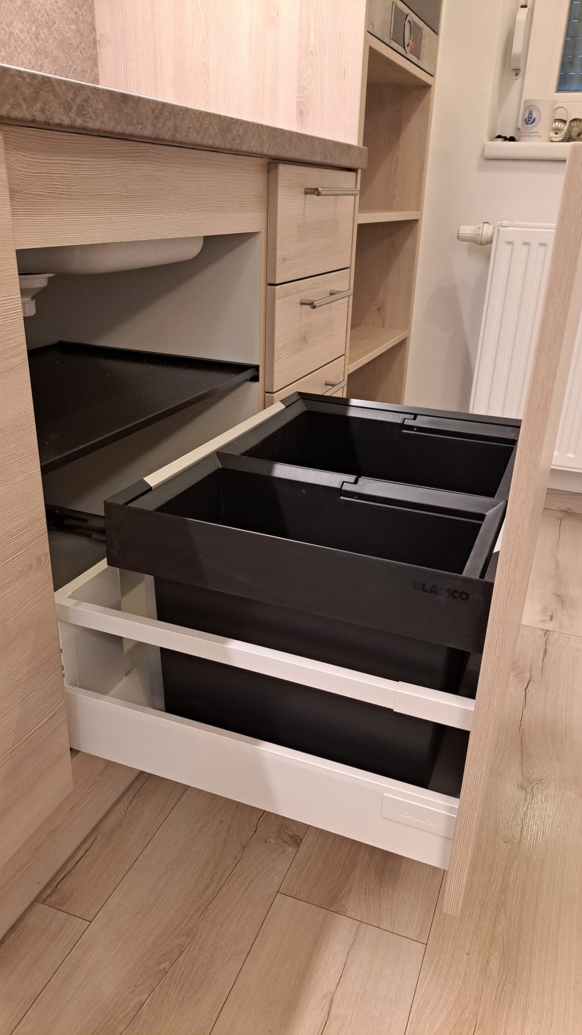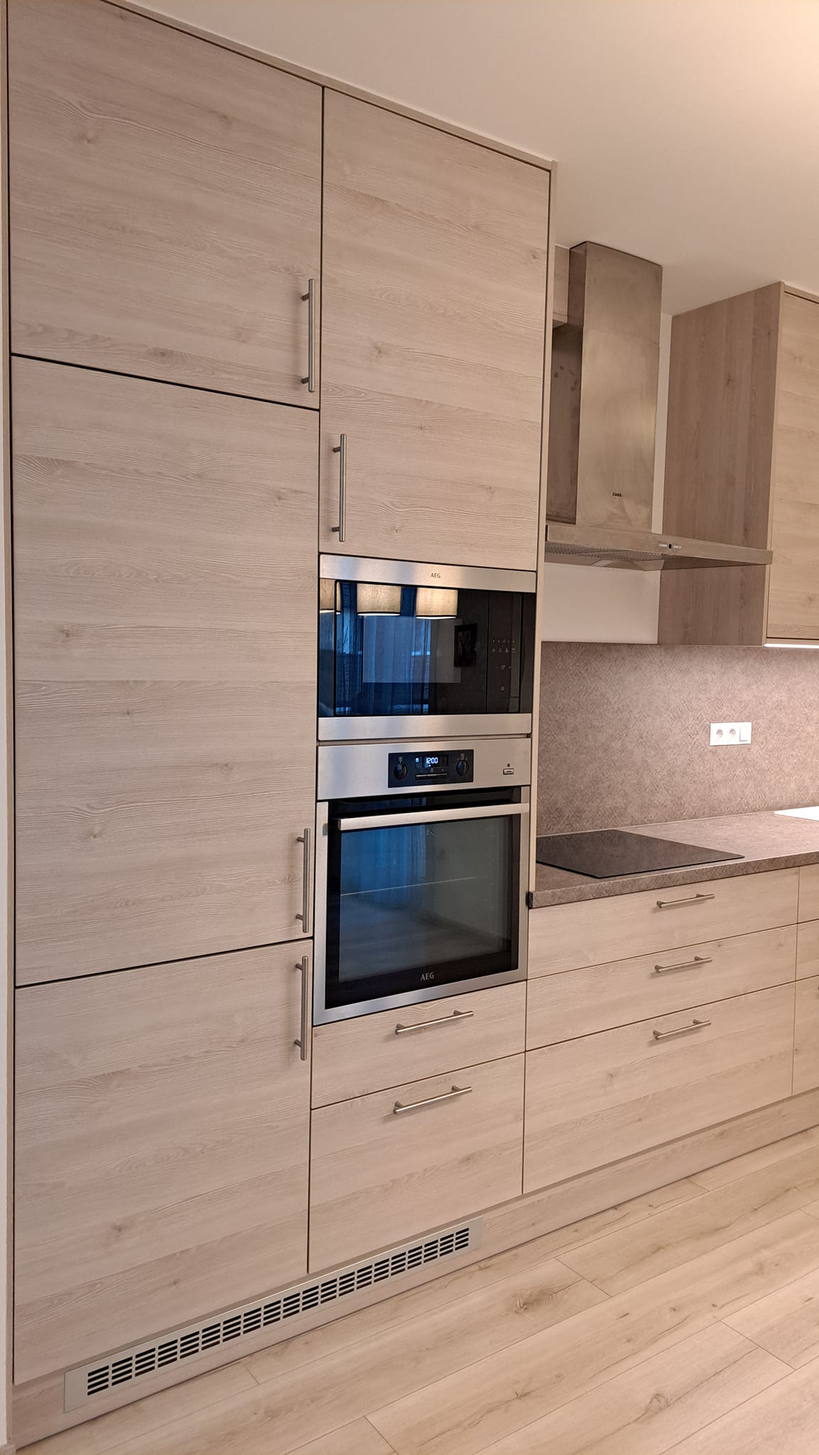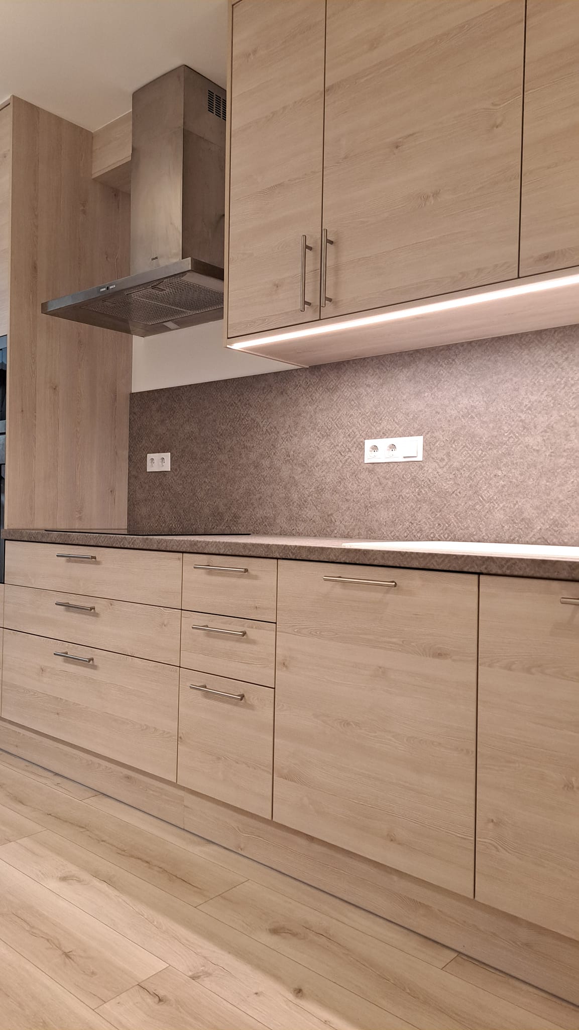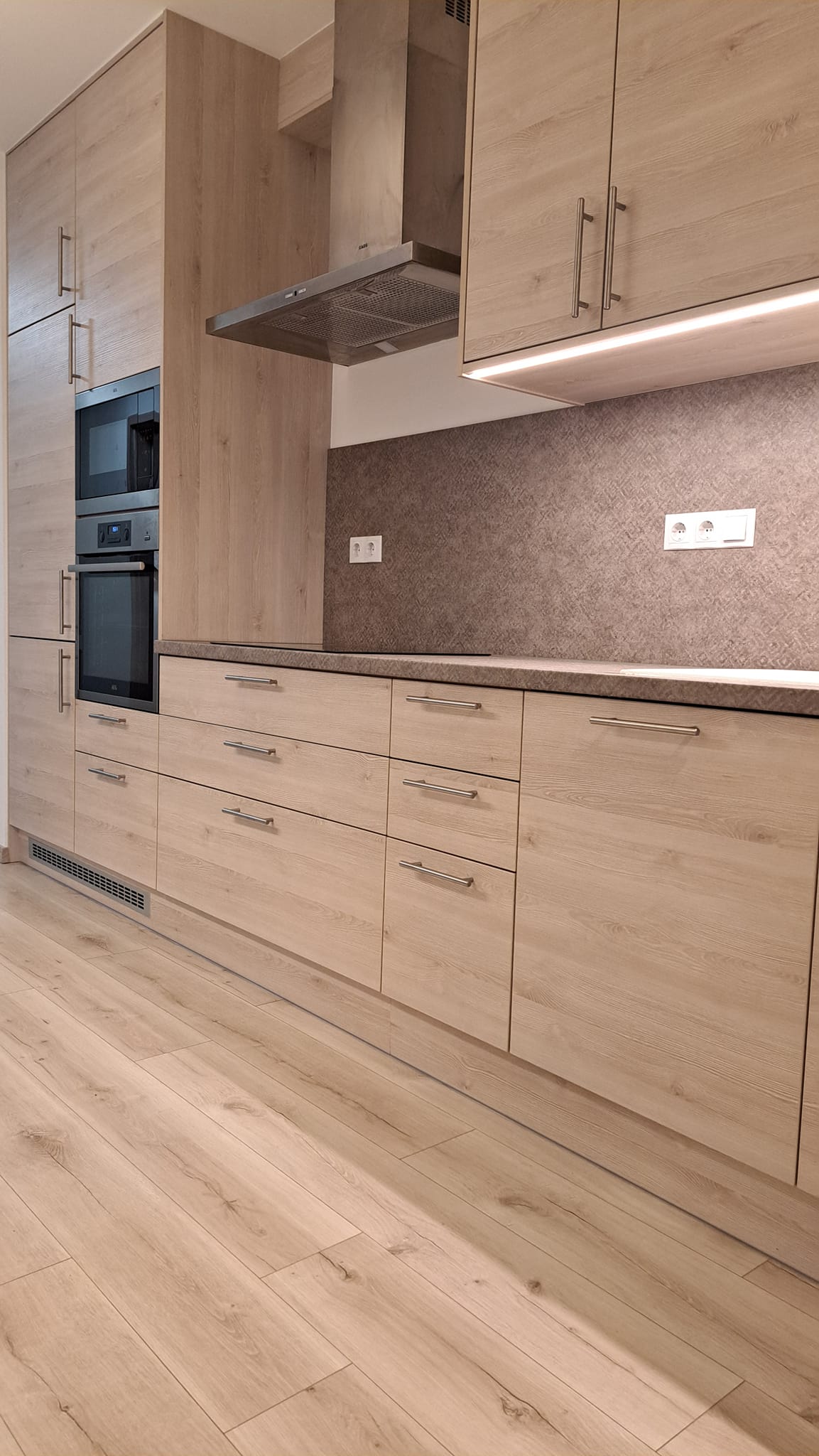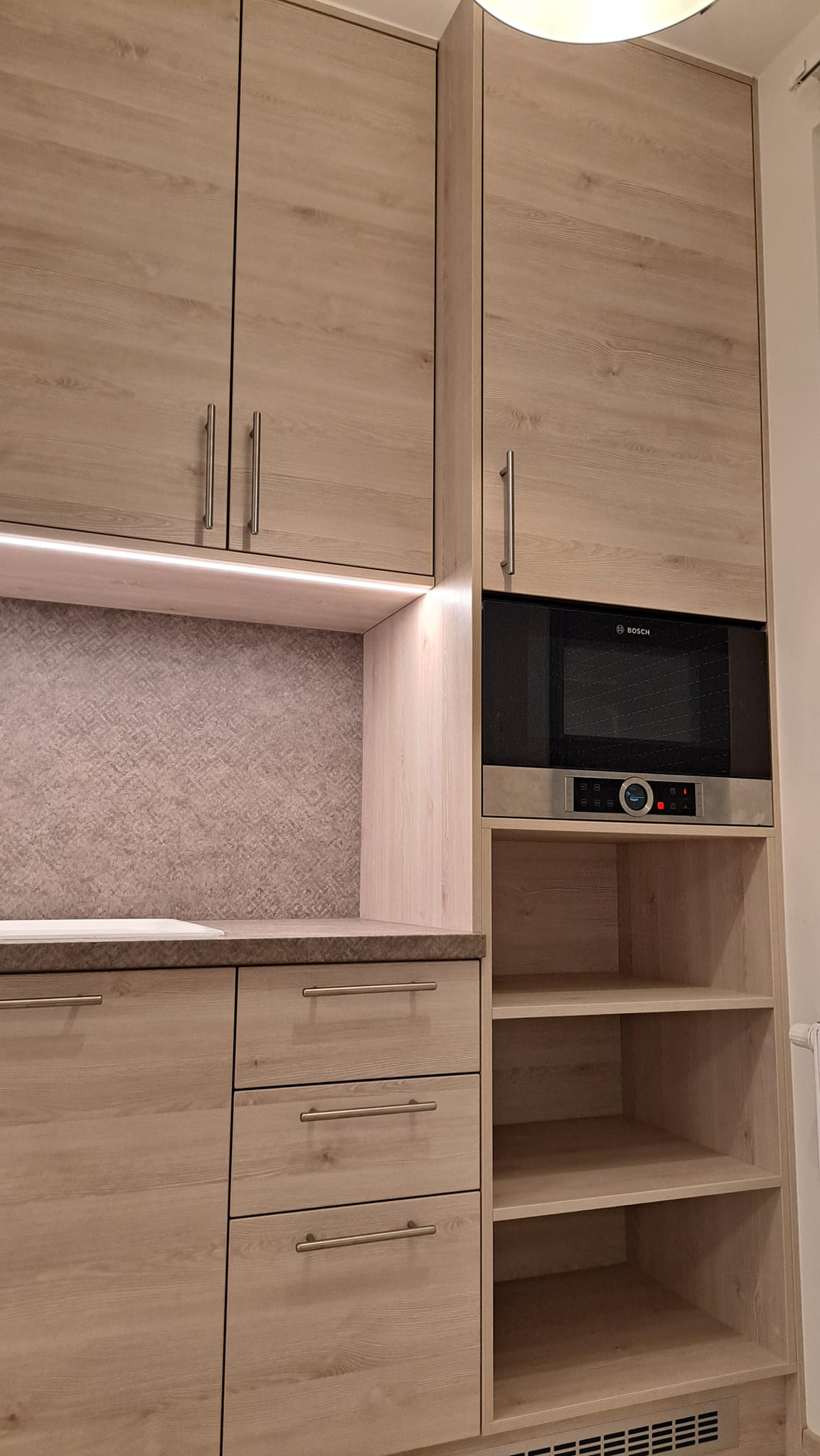 Itt láthattok építés közbeni képeket is erről a konyháról. Be lett építve a gépészet, vagyis a hűtő, a sütő és a főzőlap. Beépített és elrejtett LED világítással rendelkezik és minőségi szerelvényekkel, mint például fióksínek és szemetestartó.