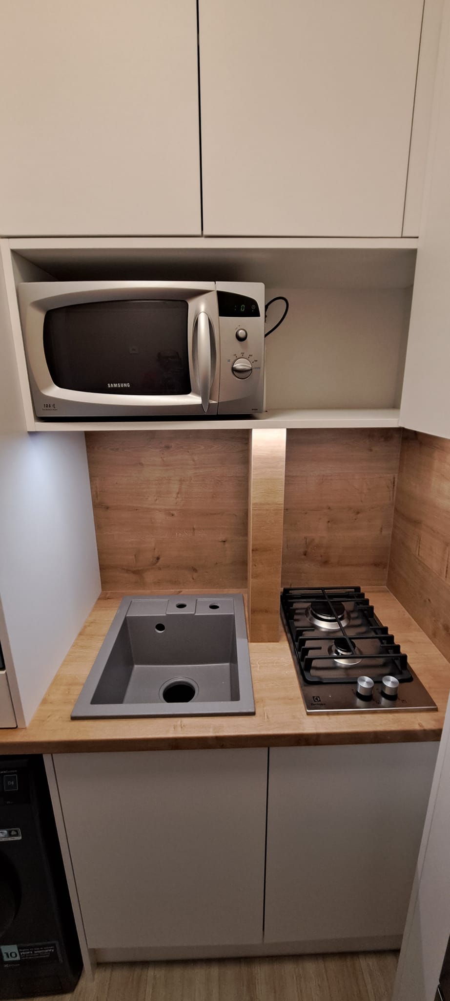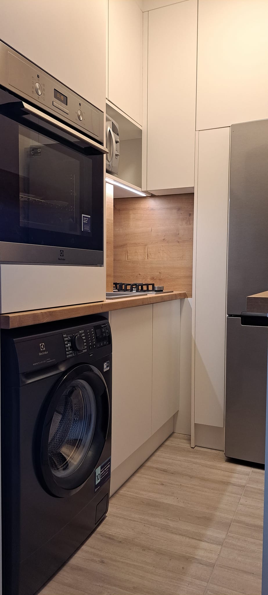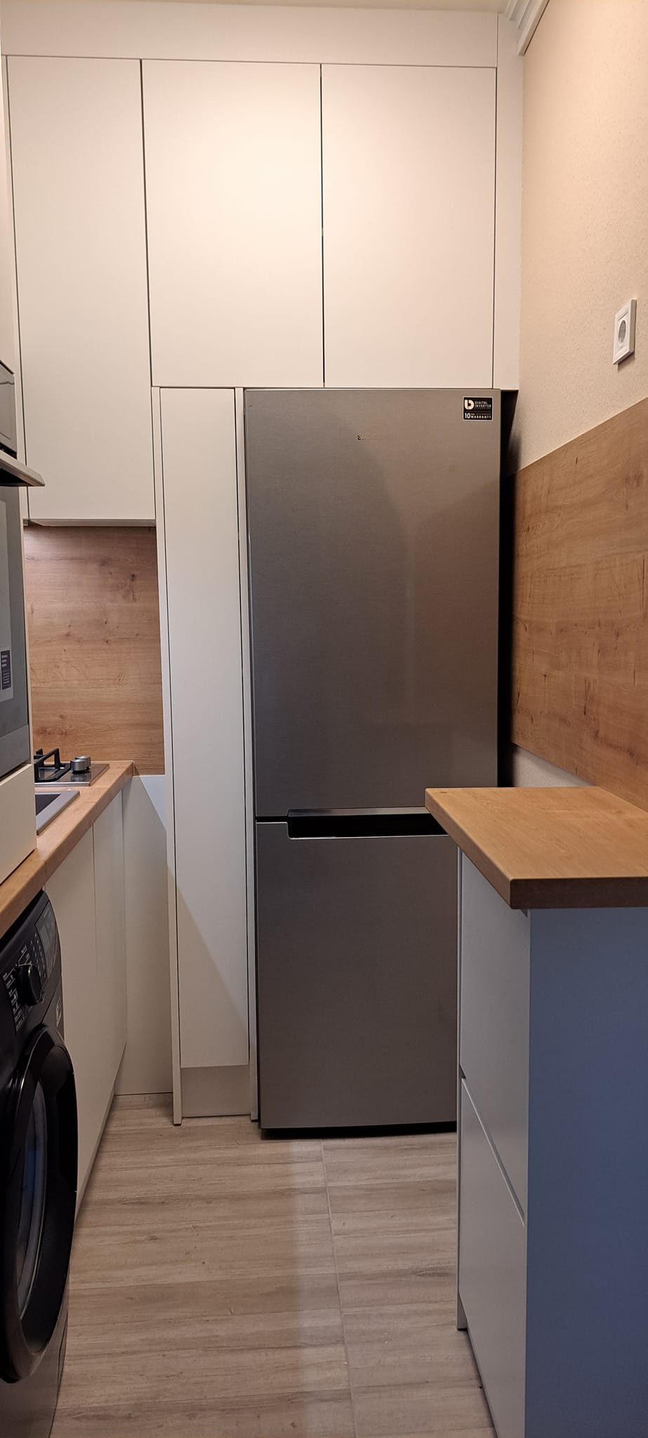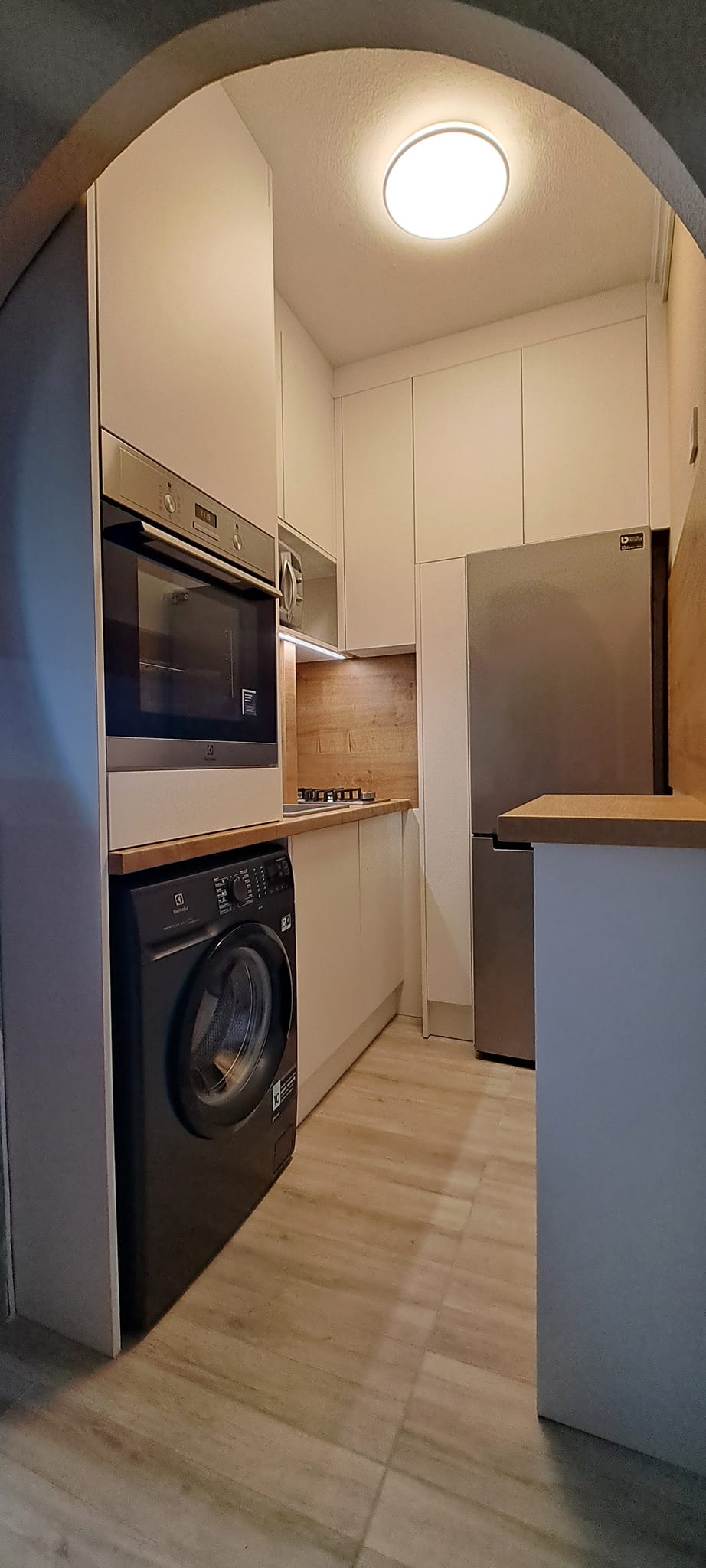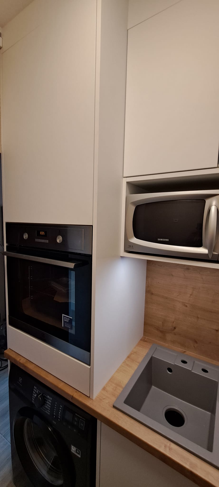 Elég kis helyre kellett csinálnunk egy konyhát. Nem volt egyszerű feladat, de okos tervezéssel megvalósítottuk a megrendelő elképzeléseit, hogy a mini konyhából a maximumot tudja kihozni. Fogantyú nélküli modern, letisztult dizájnt választottunk. Ezek a fiókok és ajtók nyomásra nyílnak és csukódnak, igazi prémium érzetet adva.