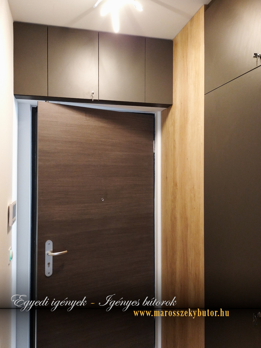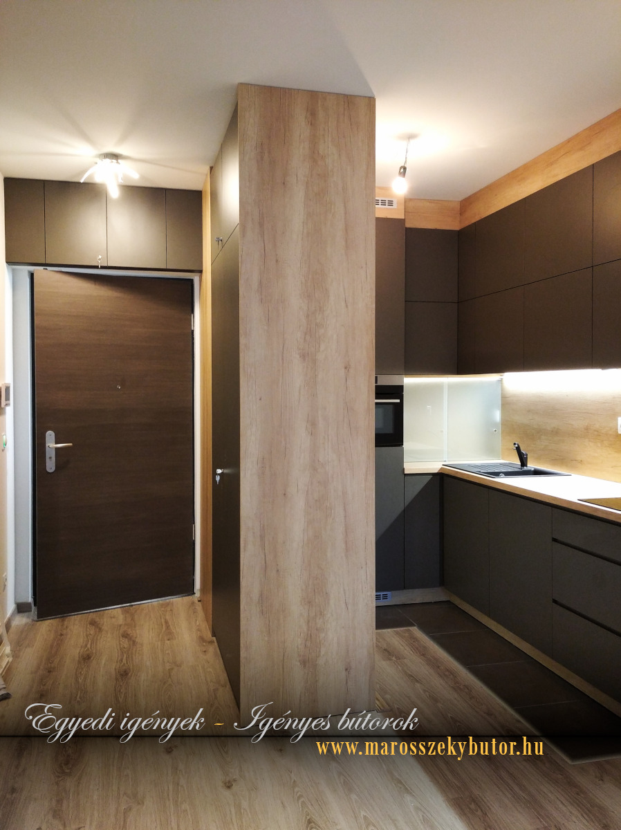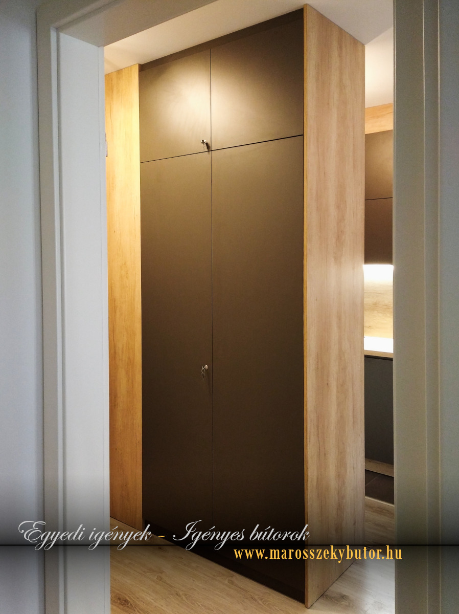 Újabb egyedi elképzelést sikerült megvalósítanom a megrendelőimnek. A konyha és a bejárati ajtó egy zárható szekrénnyel lett elválasztva, illetve az ajtó fölött is zárható tárolük kaptak helyet, ezzel is elősegítve a jobb helykihasználást. A nappaliban a médiafal rejtett világítást kapott, így igazán hangulatos az esti filmnézés.