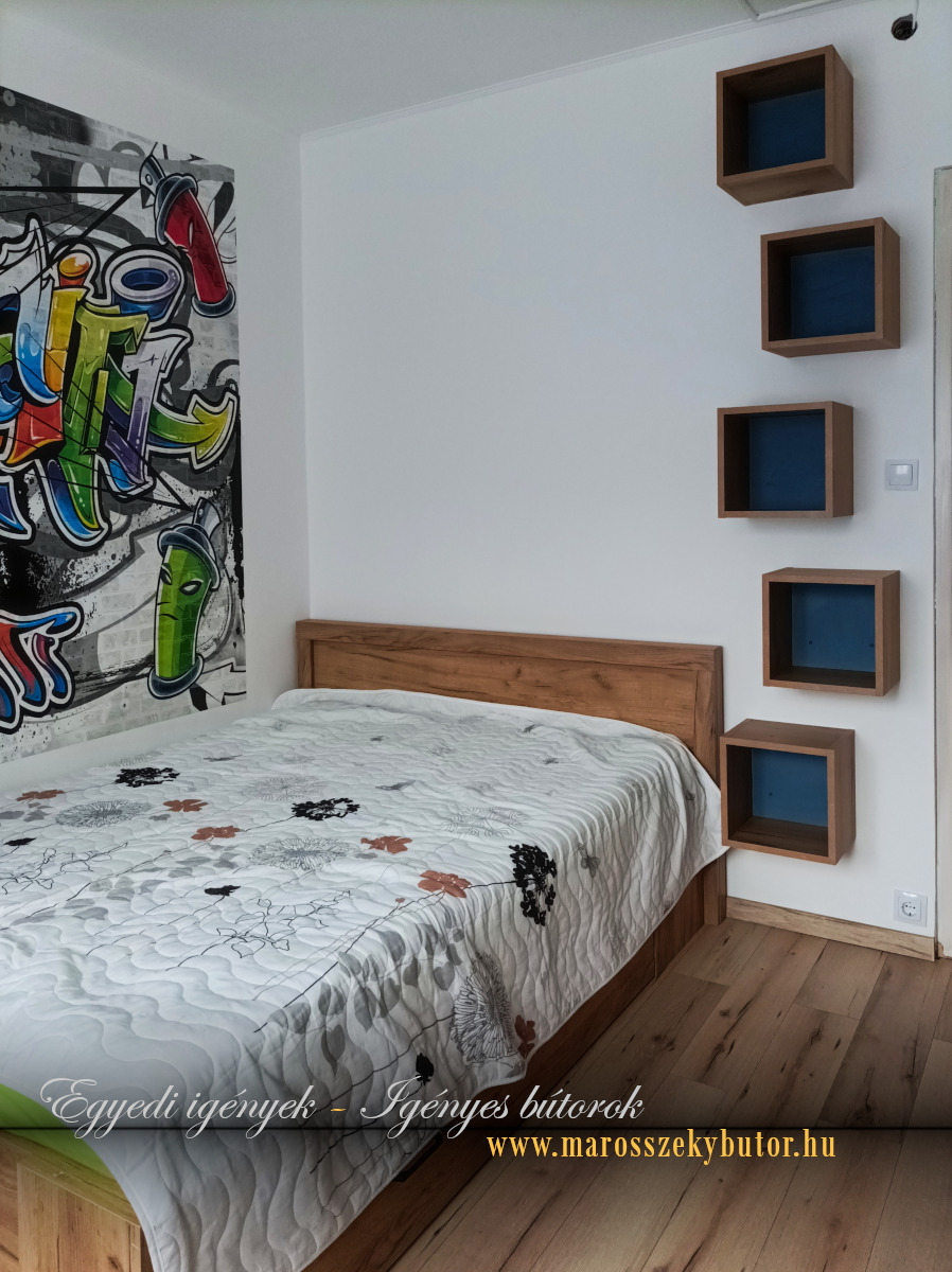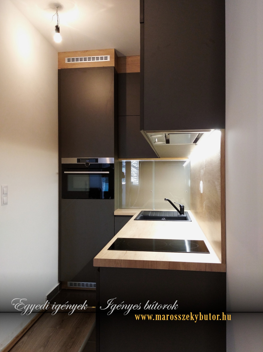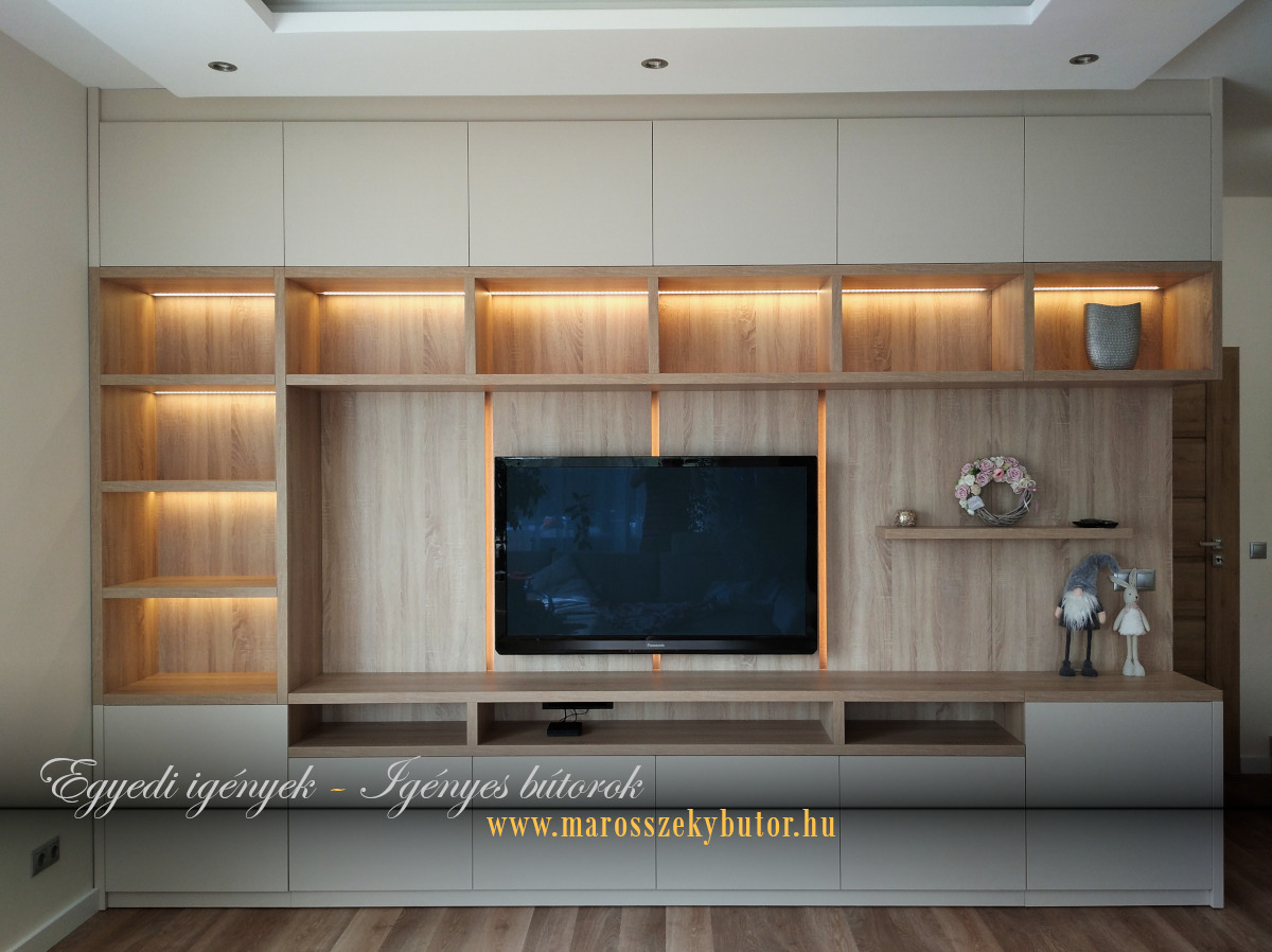 Újabb egyedi elképzelést sikerült megvalósítanom a megrendelőimnek. A konyha és a bejárati ajtó egy zárható szekrénnyel lett elválasztva, illetve az ajtó fölött is zárható tárolük kaptak helyet, ezzel is elősegítve a jobb helykihasználást. A nappaliban a médiafal rejtett világítást kapott, így igazán hangulatos az esti filmnézés.