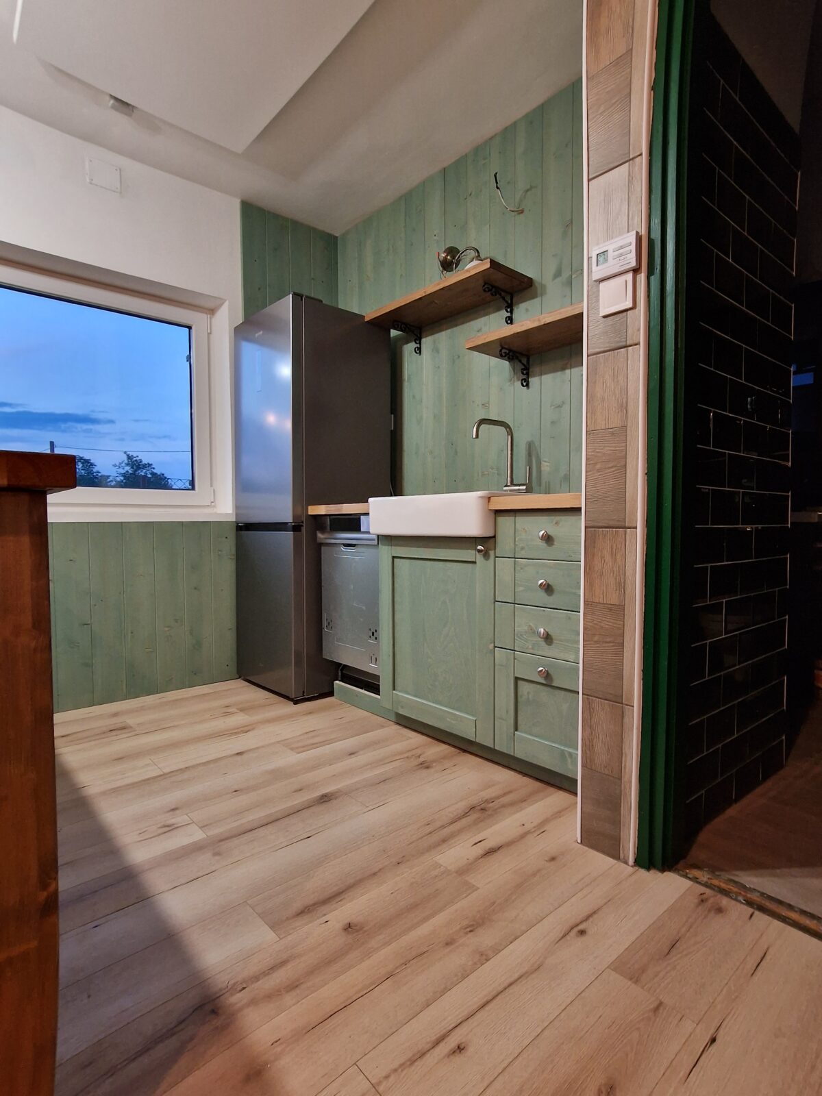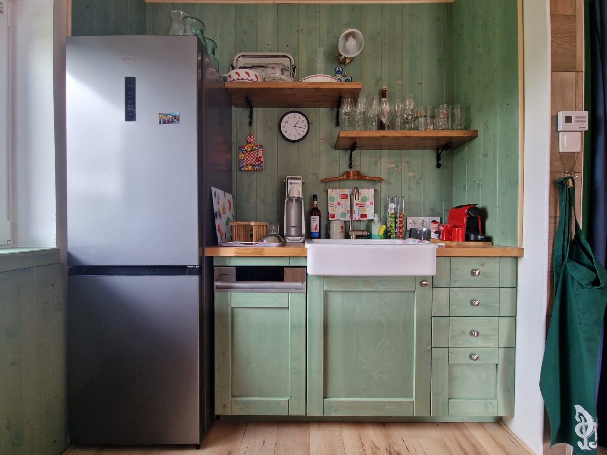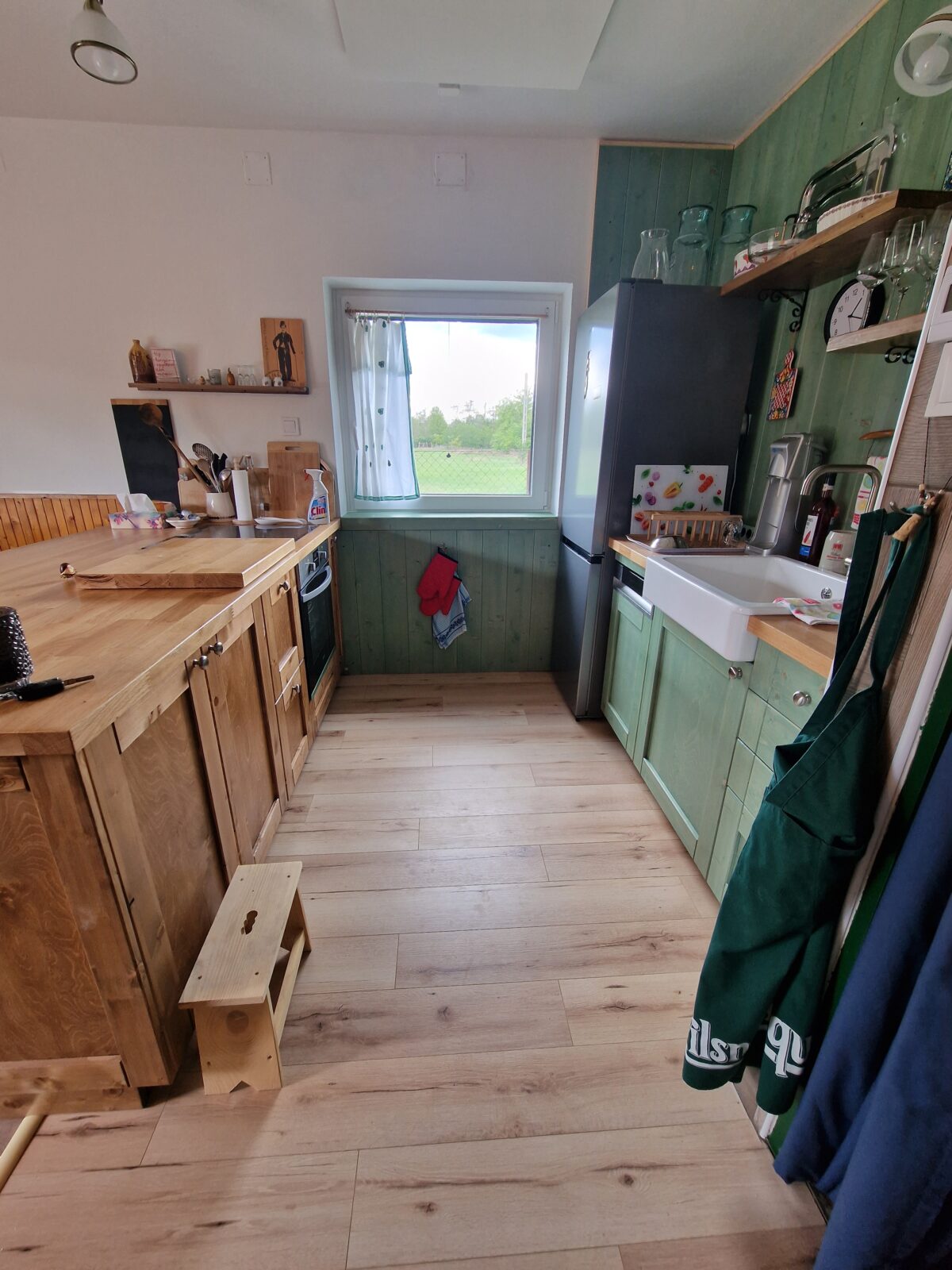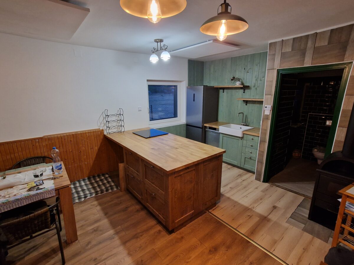 Egy sajátos színösszeállítású konyha elkészítésében kérték a segítségemet. A konyha tartalmaz beépített mosogatógépet és sütőt, csillapítottan csukódó fiókokat és a hely adottságai miatt egy konyhasziget kialakítására is lehetőség adódott.