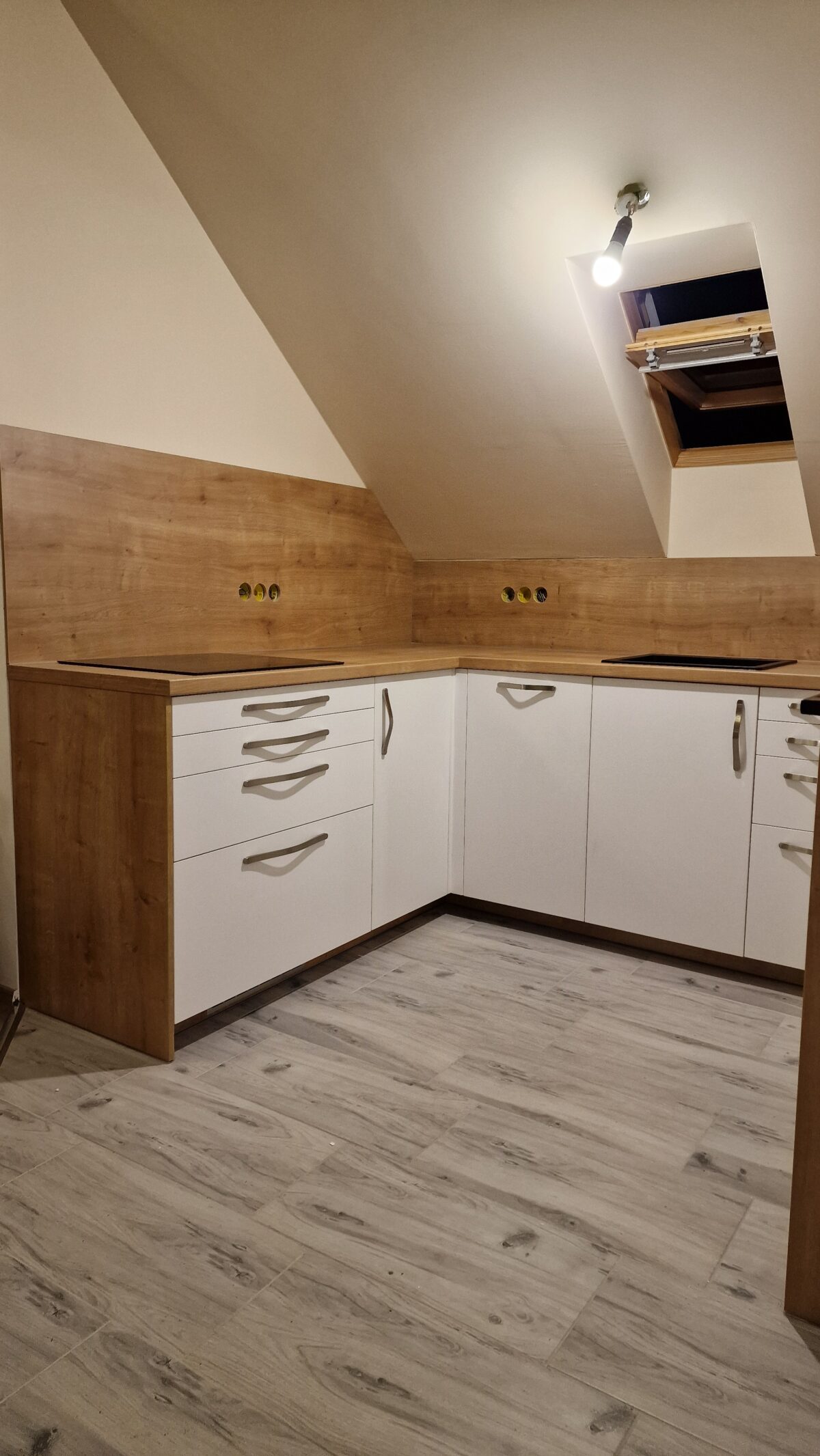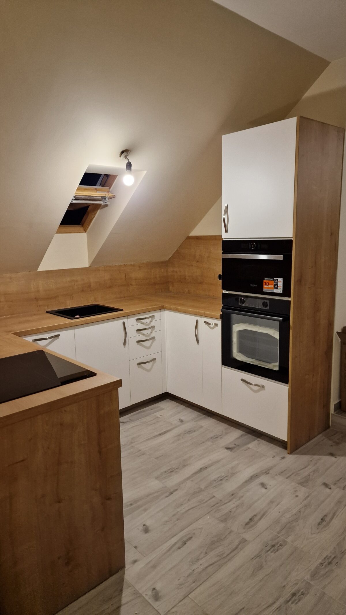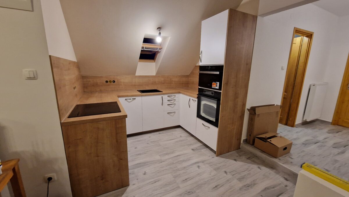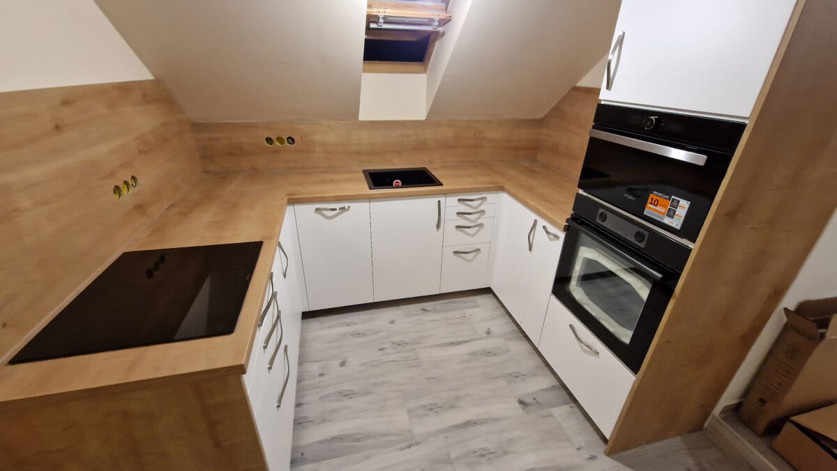 Egy tetőtéri lakásba kellett konyhát építenem. Okos tervezéssel a csökkentett belmagasság se mejelnt gondot, egy nagyszerűen használható konyhát kaptunk végeredményül.